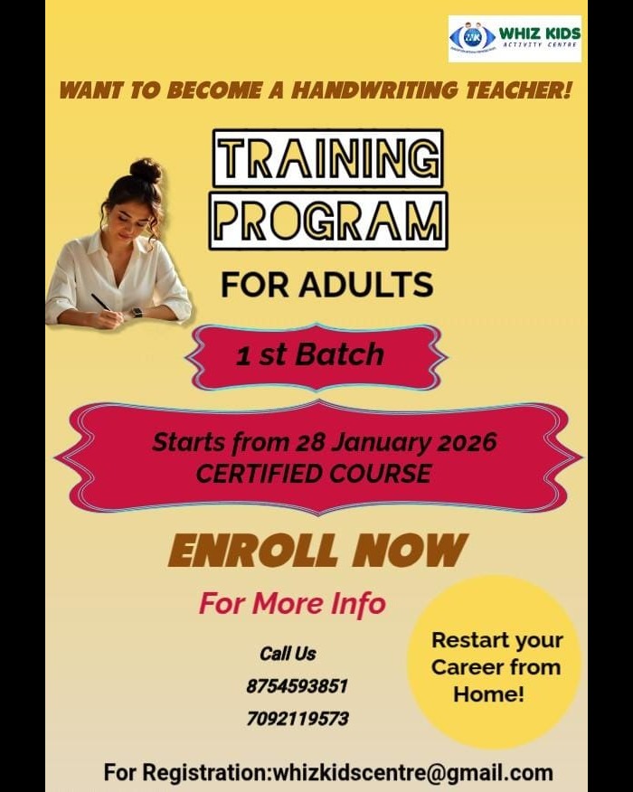 WHIZ KIDS ACTIVITY CENTRE PERAMBUR - Want to Become a Certified Handwriting Instructor! Now we are Introducing the 'HANDWRITING TRAINING PROGRAM FOR ADULTS' First Batch Starts from '28 JANUARY 2026', Join us now! Venue : No 31, Patel road, Perambur, Chennai-11, RESTART YOUR CAREER FROM HOME! .We are happy to assist for your queries, Please call us 8754593851, 7092119573. For Registration: Whizkidscentre@gmail.com.