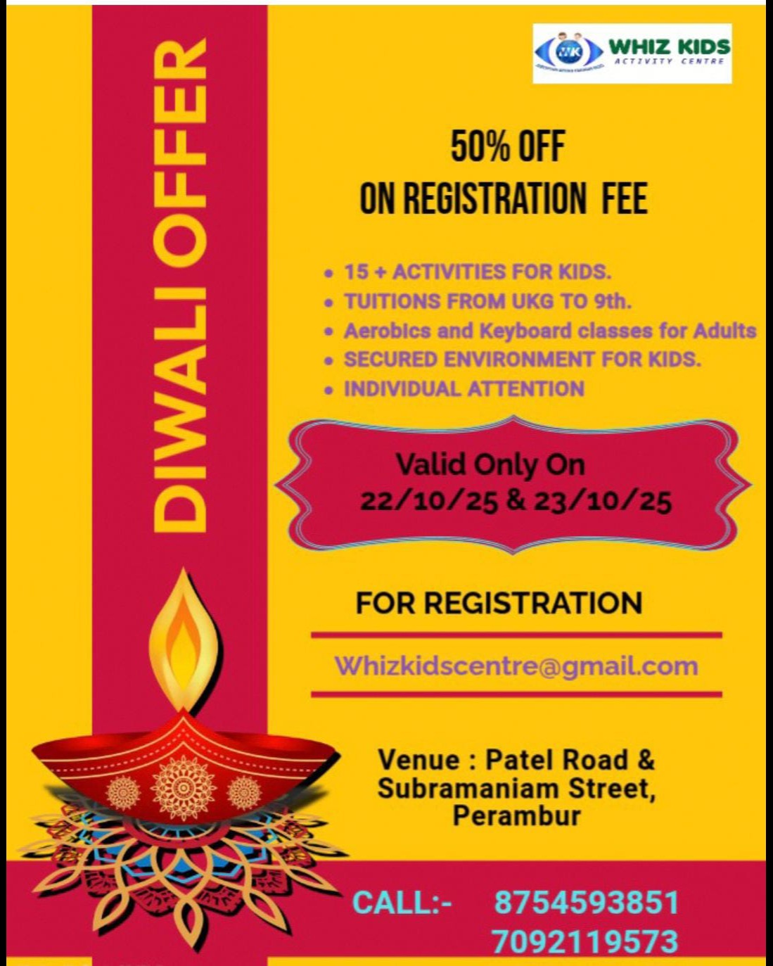 WHIZ KIDS ACTIVITY CENTRE PERAMBUR - YOUR KIDS DESERVE THE BEST EDUCATION! ON BEHALF OF WHIZ KIDS ACTIVITY CENTRE Wishing you a very Happy, Prosperous and safety Diwali to all in Advance......... NOW ADMISSION OPEN FOR DIWALI -2025, Grab the opportunity! 50% offer! on Registration fee valid only on 22/10/25 & 23/10/25 , Join us now! Venue : Patel Road and Subramaniam Street Perambur, Chennai-11, We are happy to assist for your queries Please call us 8754593851, 7092119573.